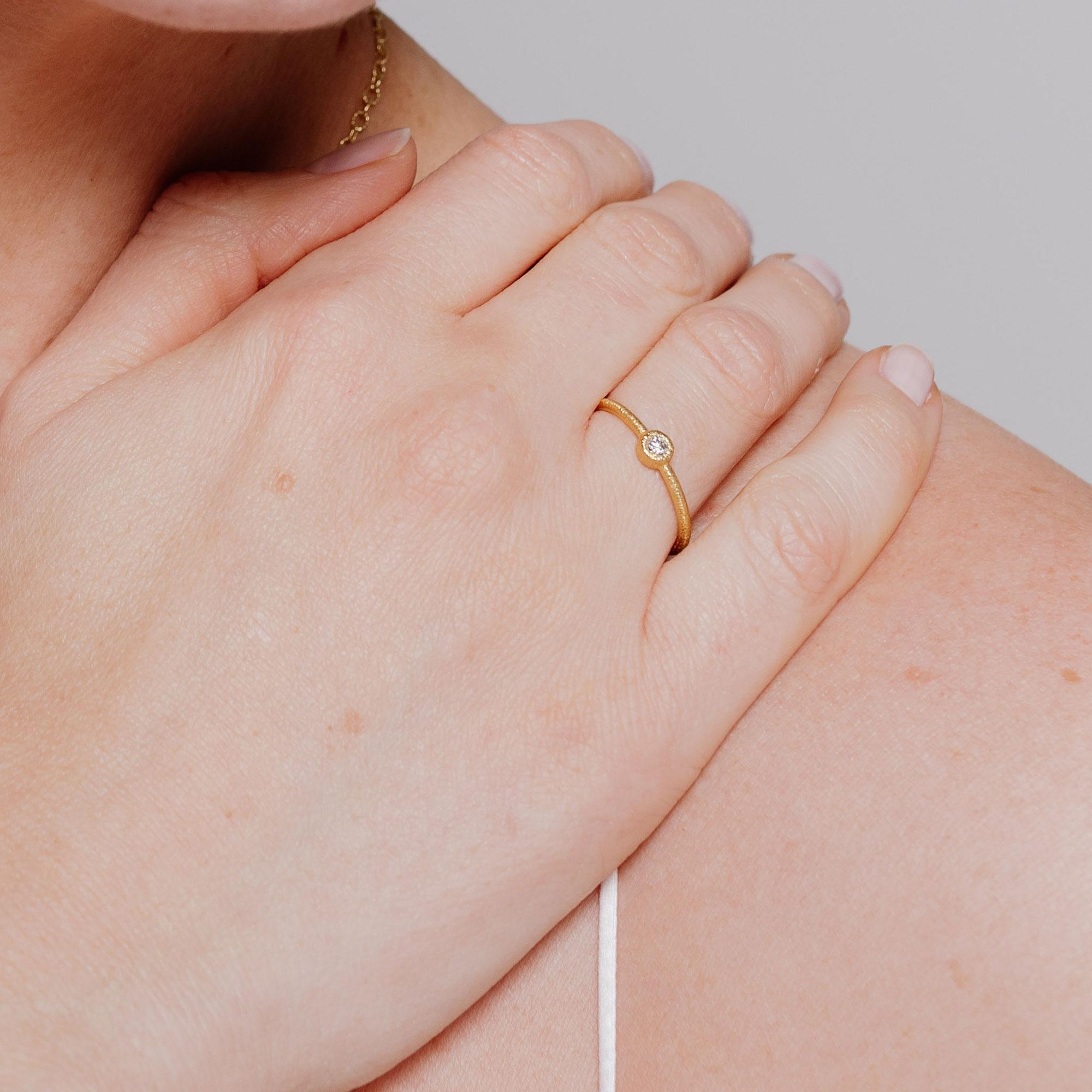 een 18 krt geelgouden ring van Brigitte Adolph model Iris met een diamantje briljant geslepen 0.05 crt.