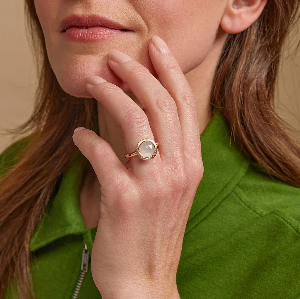 Briolet geslepen witte maansteen in subtiele Sushi ring zonder poespas. De zetting om de maansteen is gesatineerd.