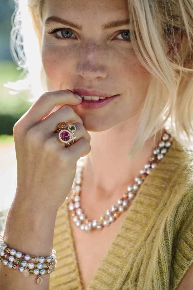 een 18 krt rosé gouden ring Bron model Sushi met een groen toermalijn steen waarom heen 20 diamantjes briljant geslepen gezet totaal 0,12 crt.