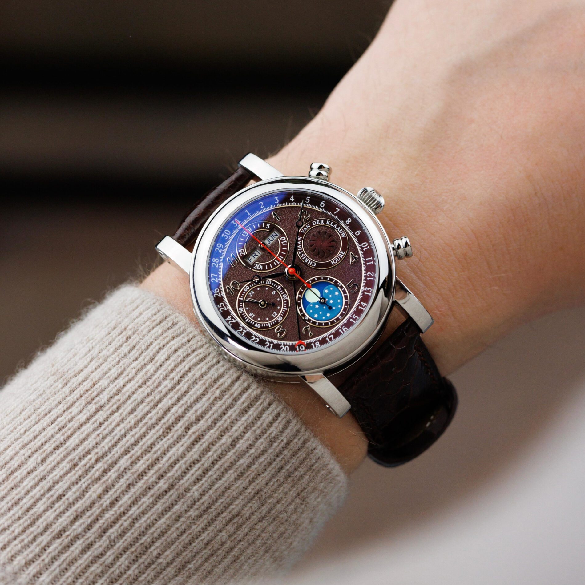 Astronomische horlogerie op z’n best, in een modern, sportief design. Deze chronograaf geeft de verstreken seconden, minuten en uren aan. Het horloge heeft een volledige datum-aanduiding, maanstand indicatie en de aanduiding van tijd op een 24-uurs schaal. Onderin op de 6 uurs positie is de maanstand af te lezen. Wanneer de Maan links van het midden staat bevindt de Maan zich in het eerste kwartier. Wanneer de beeltenis in het midden staat is het volle Maan en aan de rechterkant van het midden bevindt de Maan zich in het laatste kwartier. Indien de Maan niet zichtbaar is ziet men in het venster een prachtige sterrenhemel en is het nieuwe Maan.