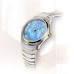 ebel sport classic heeft een blauwe parelmoer wijzerplaat met briljanten indexen (0,052crt.) en goudkleurige wijzers. De heldere kleur van de wijzerplaat zorgt voor een betoverende uitstraling. De horlogeband is gemaakt van edelstaal gecombineerd met 18 karaat geelgoud. Ook in de horlogekast en schroeven zit 18 karaat geelgoud verwerkt. De kast heeft een diameter van 33 millimeter. Het model is bovendien tot 50 meter waterdicht.