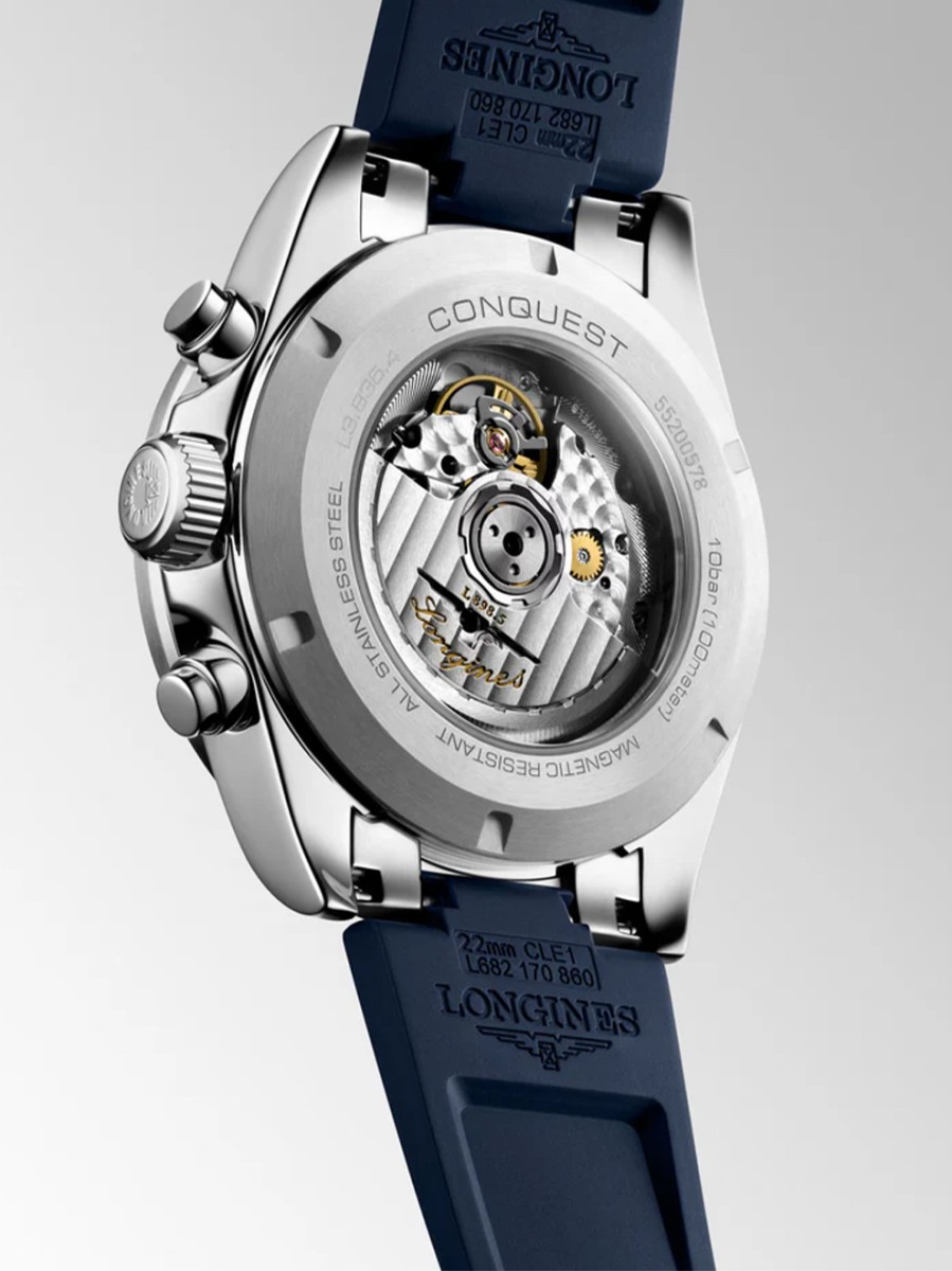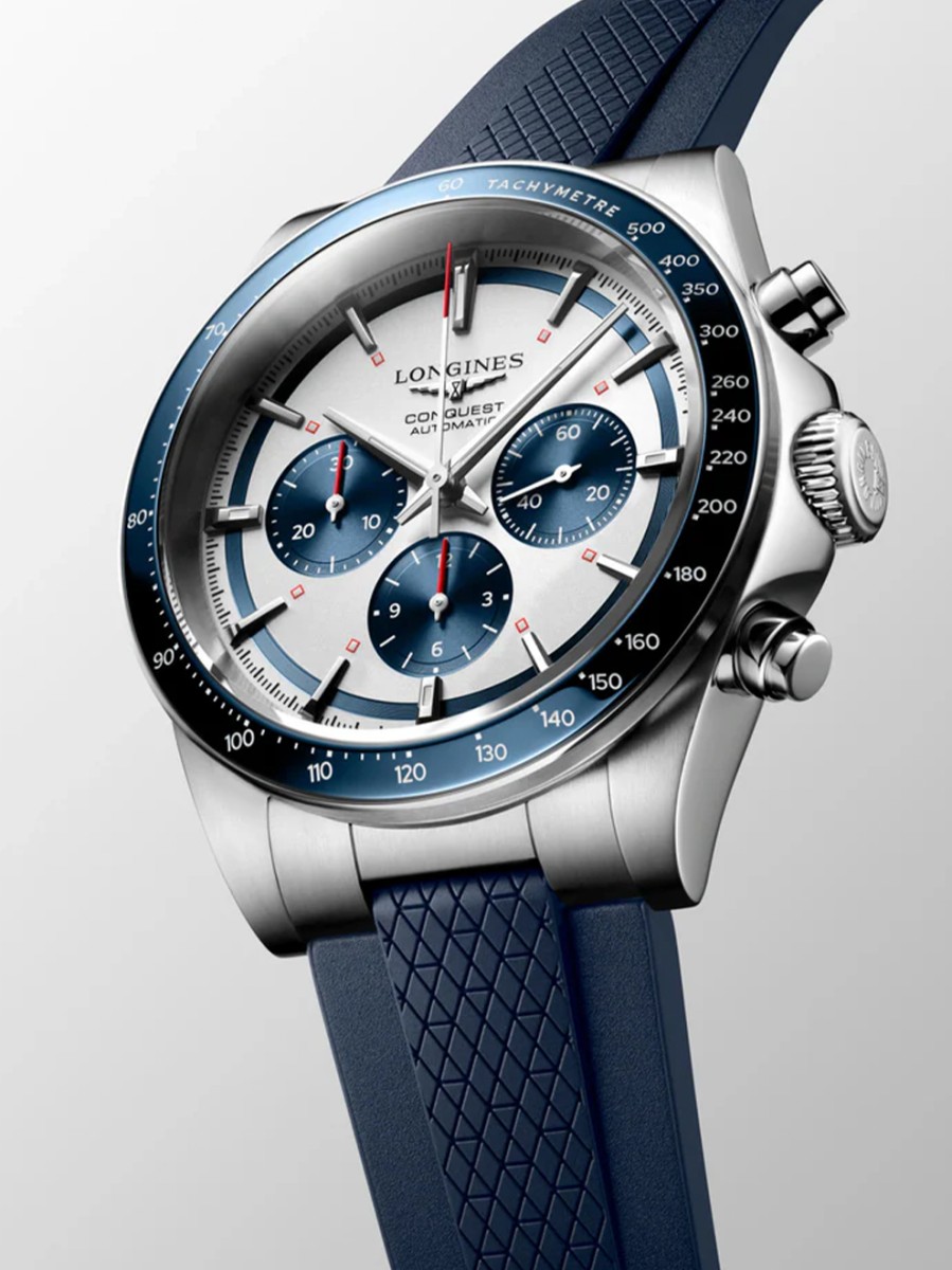 De Conquest, het ultieme alledaagse horloge, was ook de eerste LONGINES-collectie waarvan de naam in 1954 werd beschermd door het Zwitserse federale instituut voor intellectueel eigendom. De collectie is sindsdien geëvolueerd op het vlak van design en technologie, maar is trouw gebleven aan haar oorspronkelijke identiteit en straalt een harmonieuze mix uit van durf, hedendaags design en sportieve elegantie. Elk Conquest Chronograph-horloge toont het onwrikbare streven van LONGINES naar prestaties en uitmuntende uurwerken. Deze chronografen worden aangedreven door een exclusief LONGINES-kaliber met een siliconen balansveer.