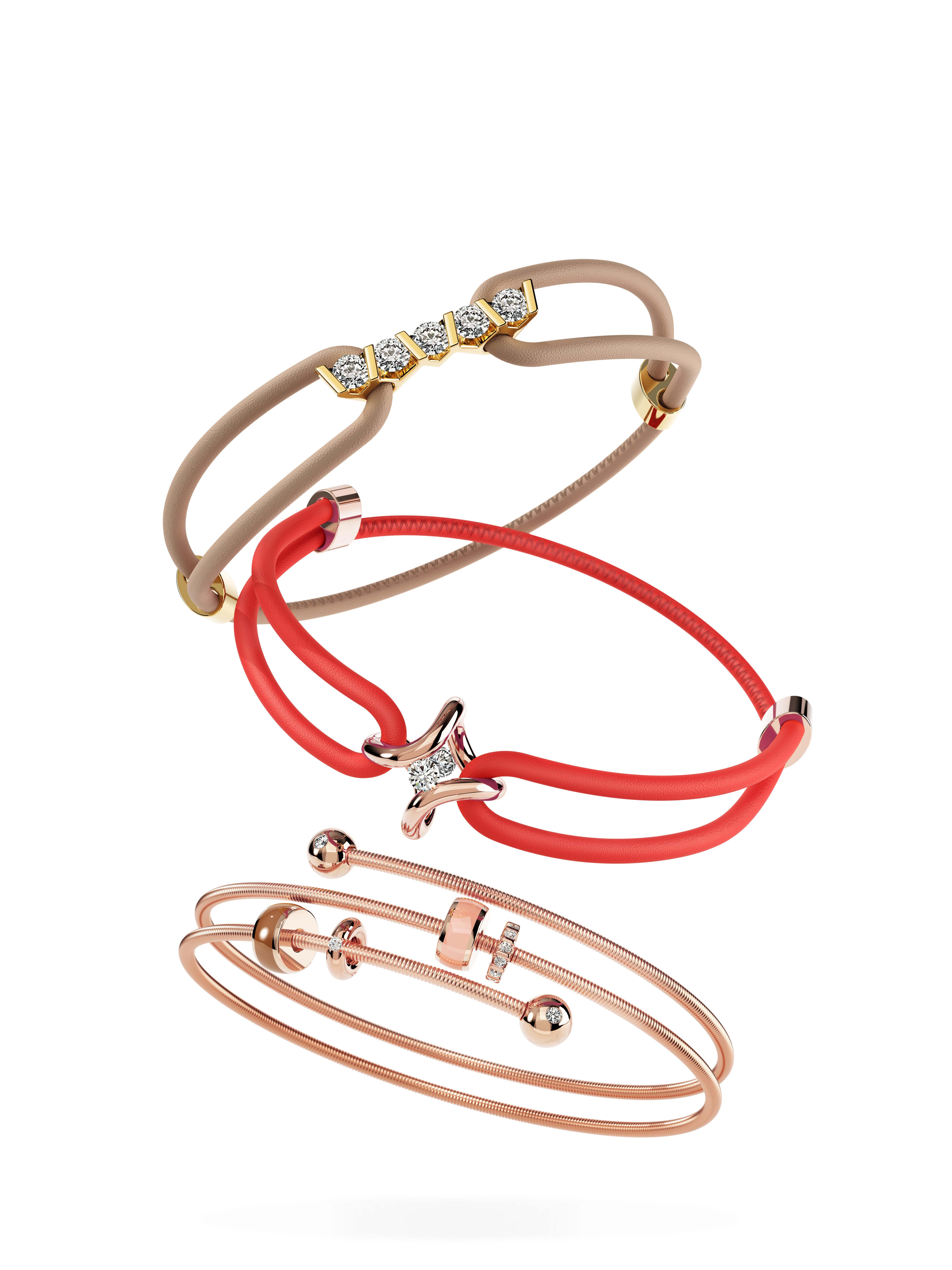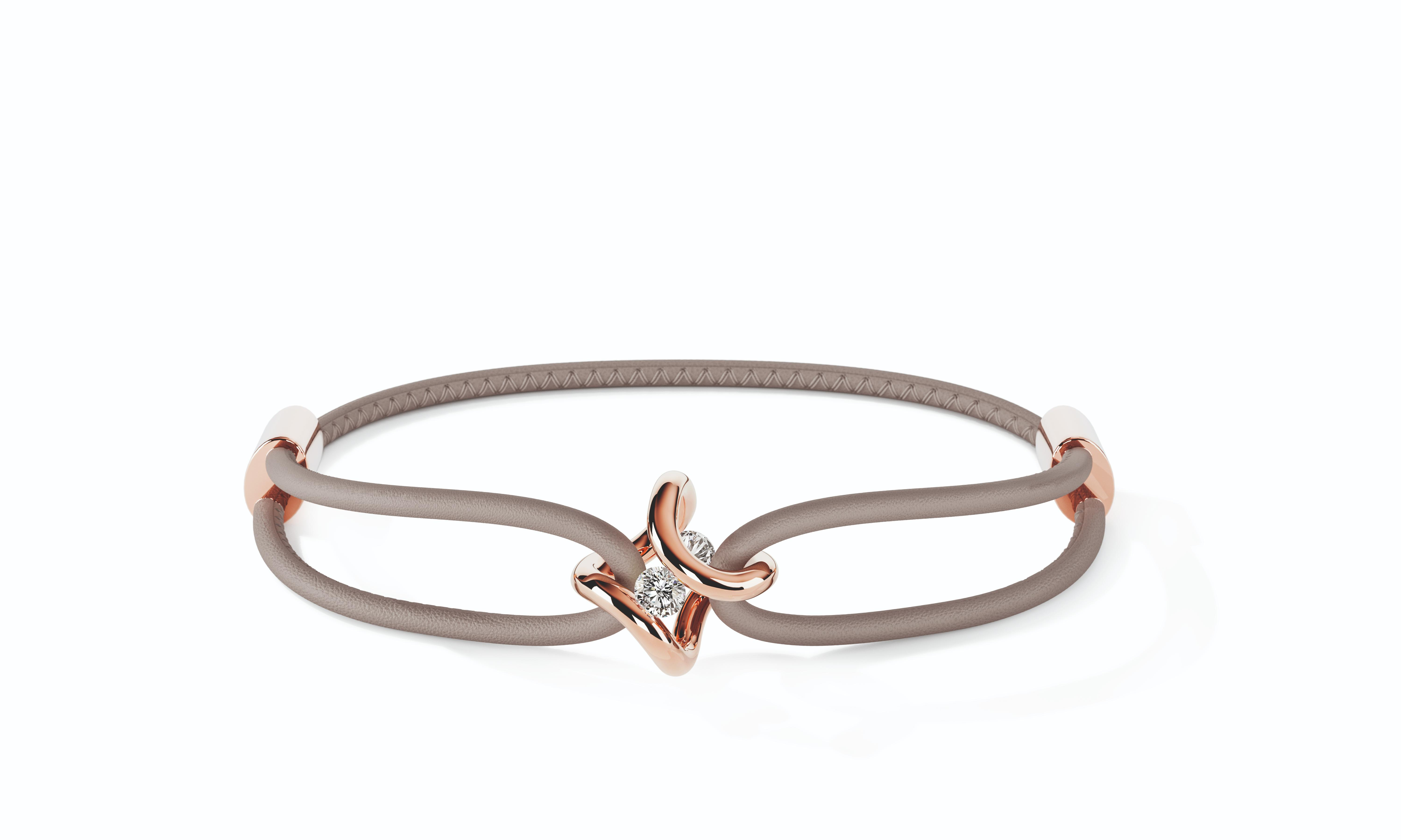 een leren armband Niessing met 18 krt element Era ertussen. en bezet met 2 diamantjes briljant geslepen totaal 0.10 crt.
