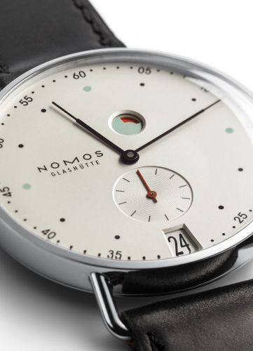 Metro date power reserve, designed by Mark Braun, is young and sophisticated, yet Glashütte through and through. The power reserve indicator doesn’t only remind wearers when to rewind, it is also one of the design features. Others include hands as fine as quill tips and colorful hour indexes. And the hand-wound NOMOS caliber DUW 4401 is within, setting the pace, equipped with our proprietary escapement