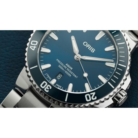Een Oris horloge model Aquis Date met een blauwe wijzerplaat en lunette en een stalen band.