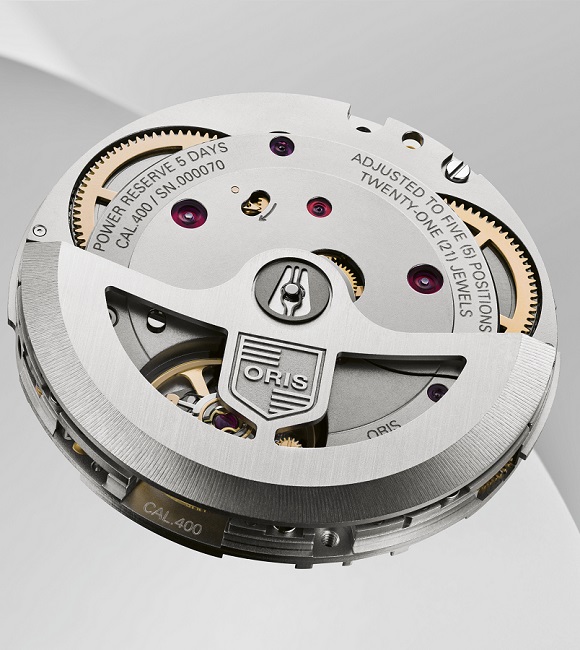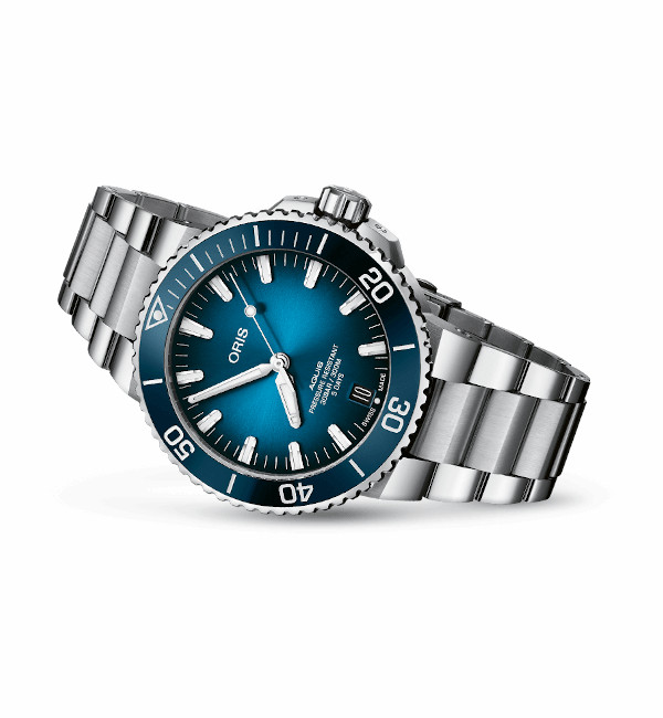 Een Oris horloge model Aquis Date met blauwe wijzerplaat en lunette en een stalen band.