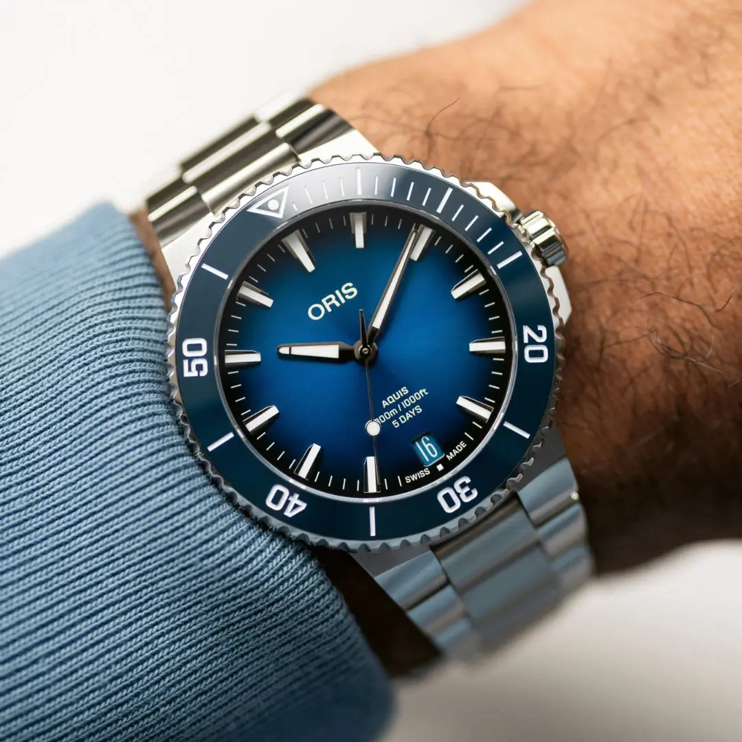 Een Oris horloge model Aquis Date Calibre 400 met een blauwe wijzerplaat en lunette en een stalen band.