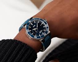 Een Oris Aquis Small Second Date blauwe wijzerplaat en blauwe Caoutchouc band.