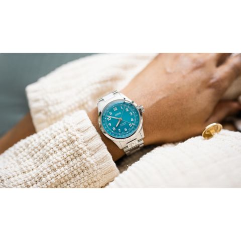 Het horloge is uitgevoerd met een 40 mm roestvrijstalen kast, voorzien van een gepolijste lunette en de iconische grote kroon. De diepblauwe wijzerplaat creëert een elegante en toch opvallende uitstraling. Het horloge beschikt over Oris’ kenmerkende Pointer Date-functie, waarbij een centrale wijzer de datum aanwijst langs de rand van de wijzerplaat – een detail dat zowel visueel als functioneel uniek is.
