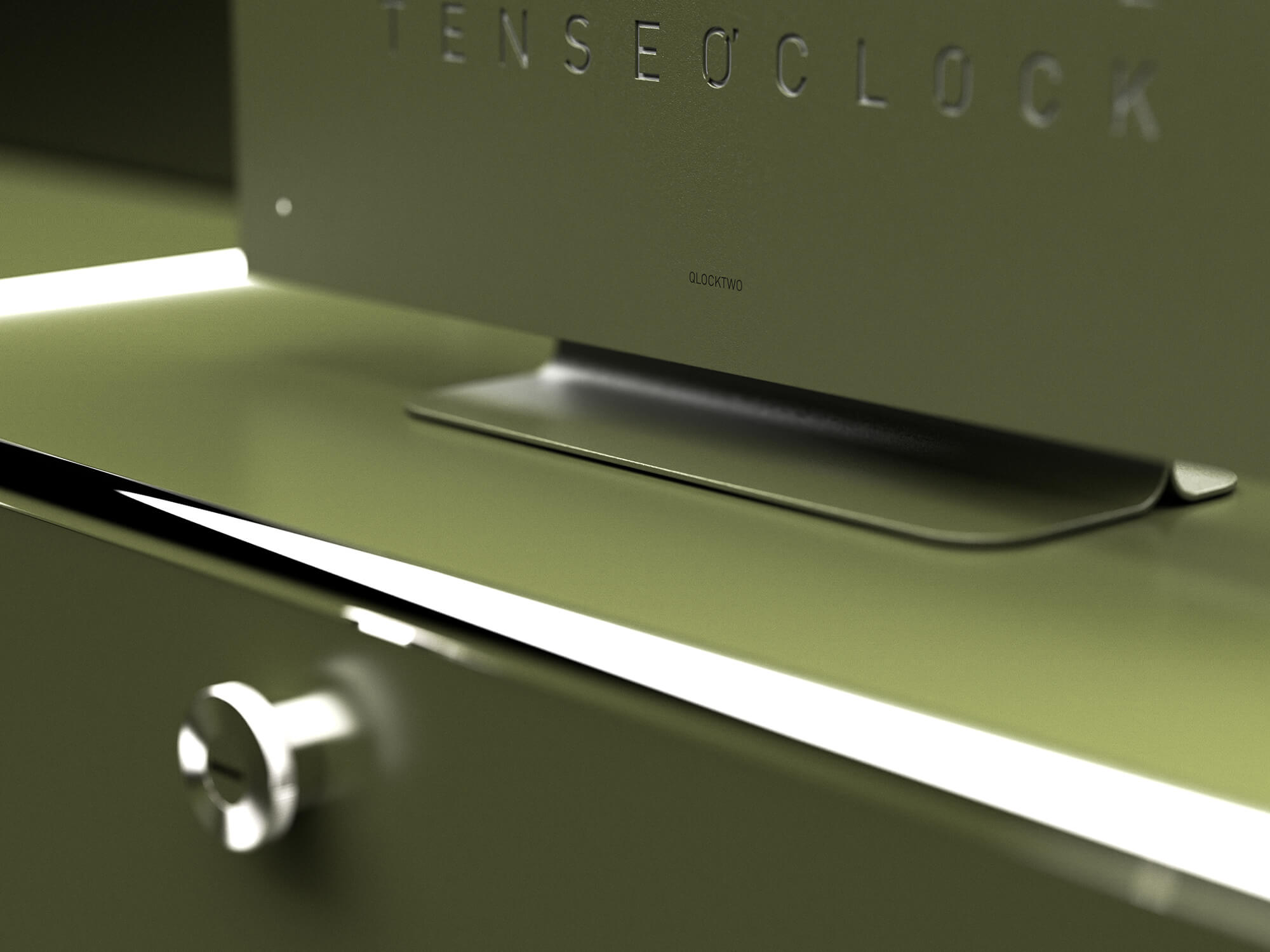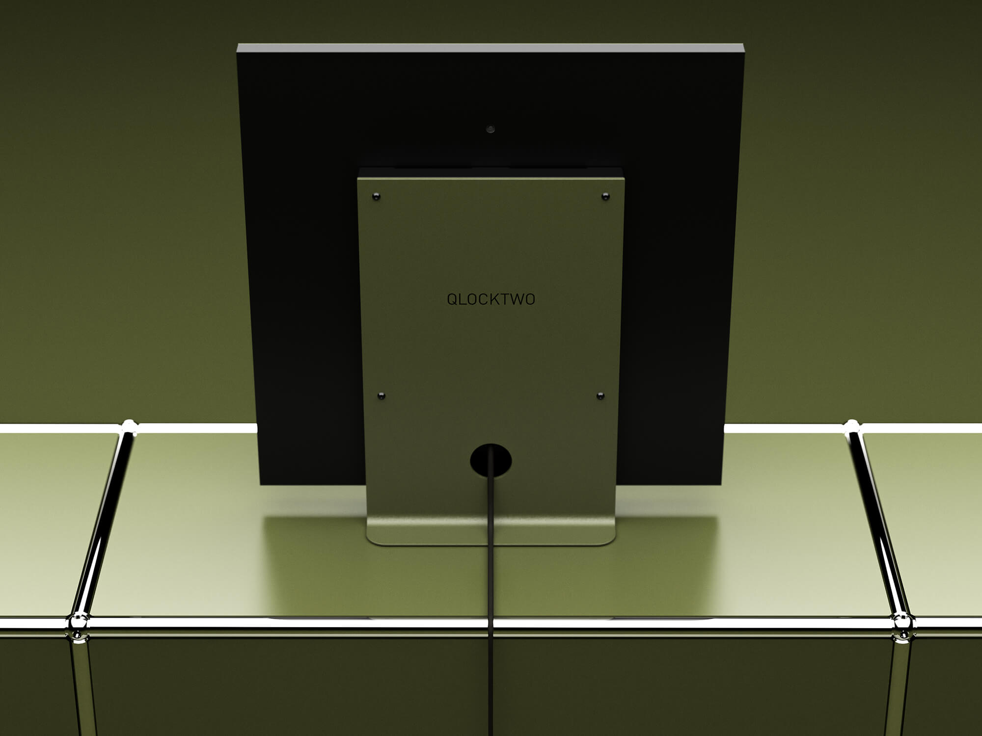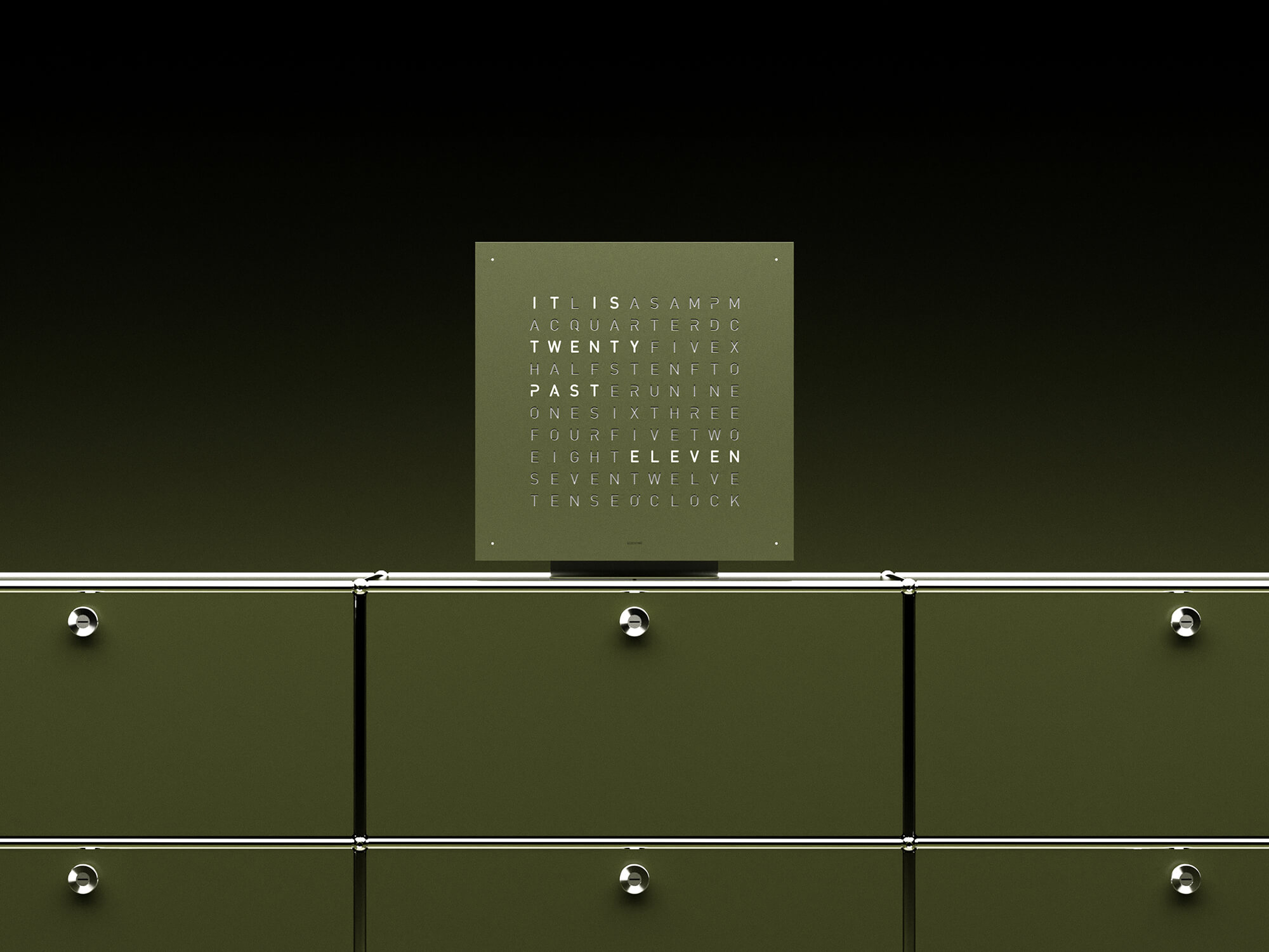 Een klok van Qlocktwo model Earth 45x45 in kleur Oliver Green limited edition.