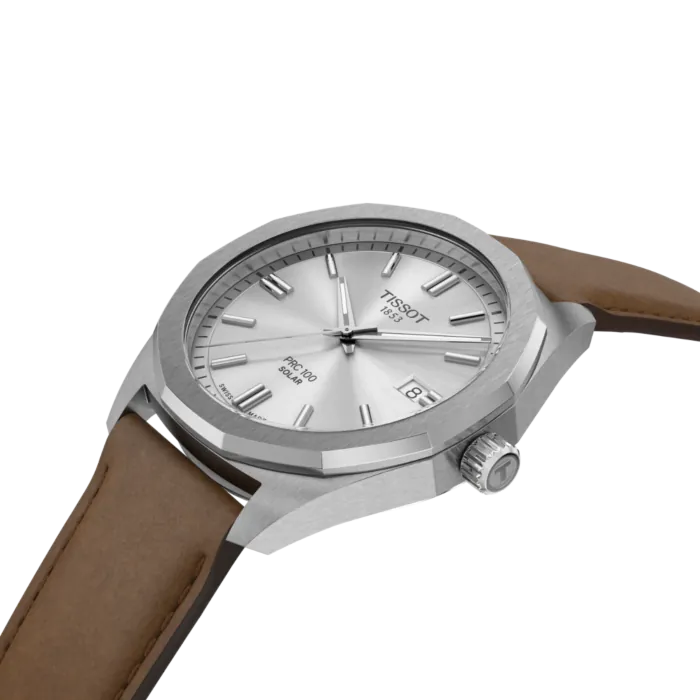 Een polshorloge Tissot model Solar met een zilver kleurige wijzerplaat en bruine band.